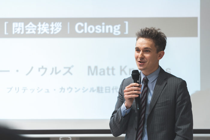 フォーラムの最後は、共同主催であるブリティッシュ・カウンシルの駐日代表、マシュー・ノウルズ氏が閉会の挨拶で結んだ。この日の議論を「創造性が、さまざまな社会課題に取り組むことができ、都市を再生し形づくる力になることが分かりました」と総括した。「東京2020オリンピック・パラリンピック」の開催を控えた今年、さまざまな点で共通項のある横浜とダンディーの都市間の交流と、日英両国の発展への期待とともに、フォーラムを締めくくった。