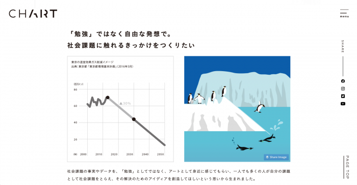 社会課題を表すチャートやグラフをアート作品に変えるプロジェクト「chart project」は、社会課題を勉強としてではなくアートとして身近に感じてもらいたいという思いからスタートした。アーティストがチャートやグラフを基に、その社会課題が解決された理想の未来を描き、それをアート作品としてクリエイティブコモンズライセンスでシェアしている。本プロジェクトは横浜のメーカー企業とタイアップしたchart作品のグッズ展開や、ワークショップ、展覧会の開催など、多角的なアプローチで広がりを見せている。
