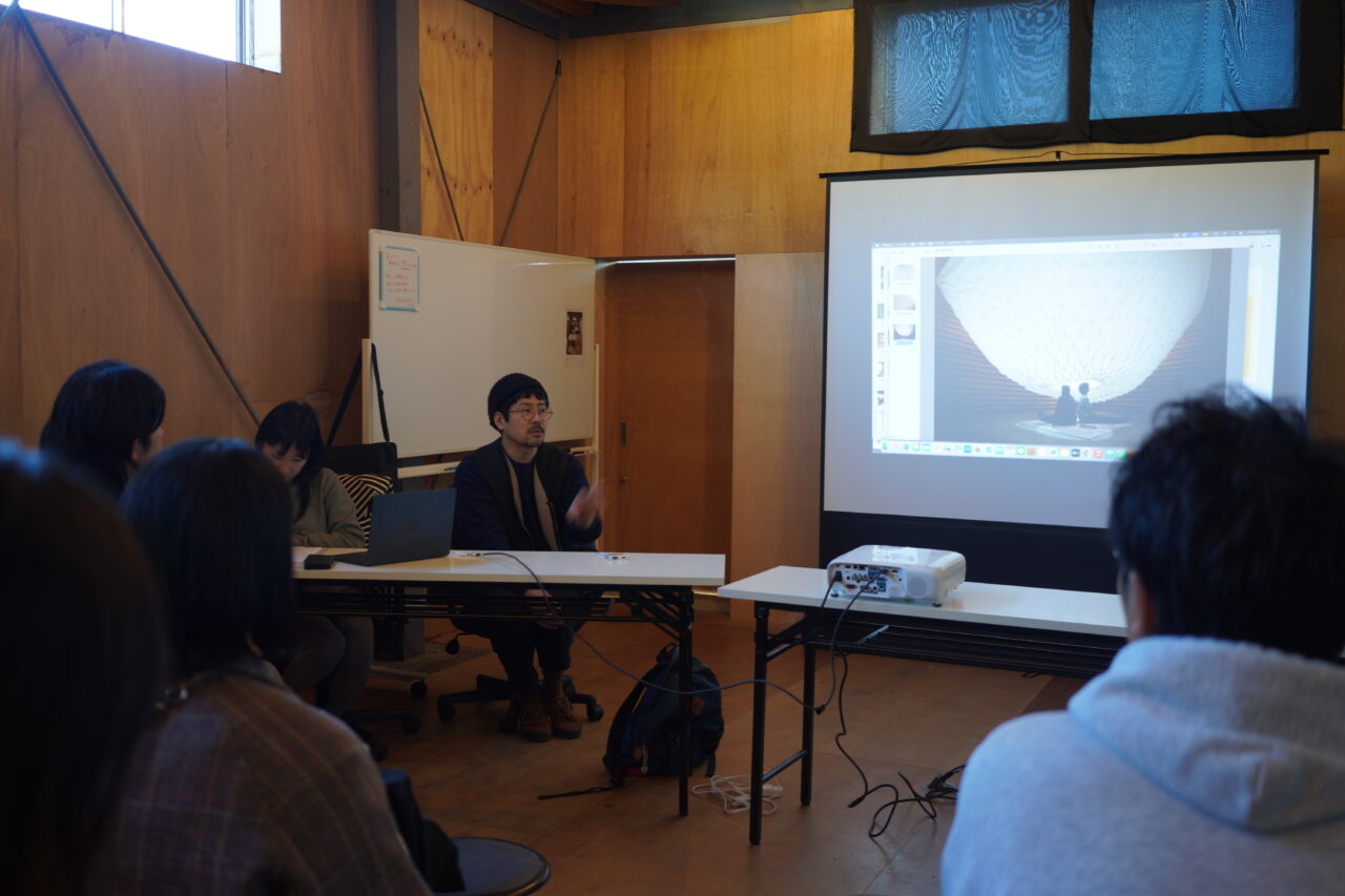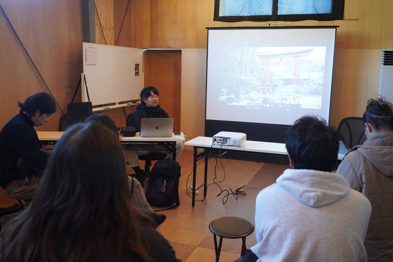 元製氷工場をリノベーションしたギャラリーFUJIHIMUROに移動し、レクチャーをしていただきます。はじめに令和の横浜使節団をACYと共同企画している株式会社リビタの土山広志さんから本事業について説明し、斎藤さんからは改めて富士吉田市について、まちづくりの視点から解説していただきました。