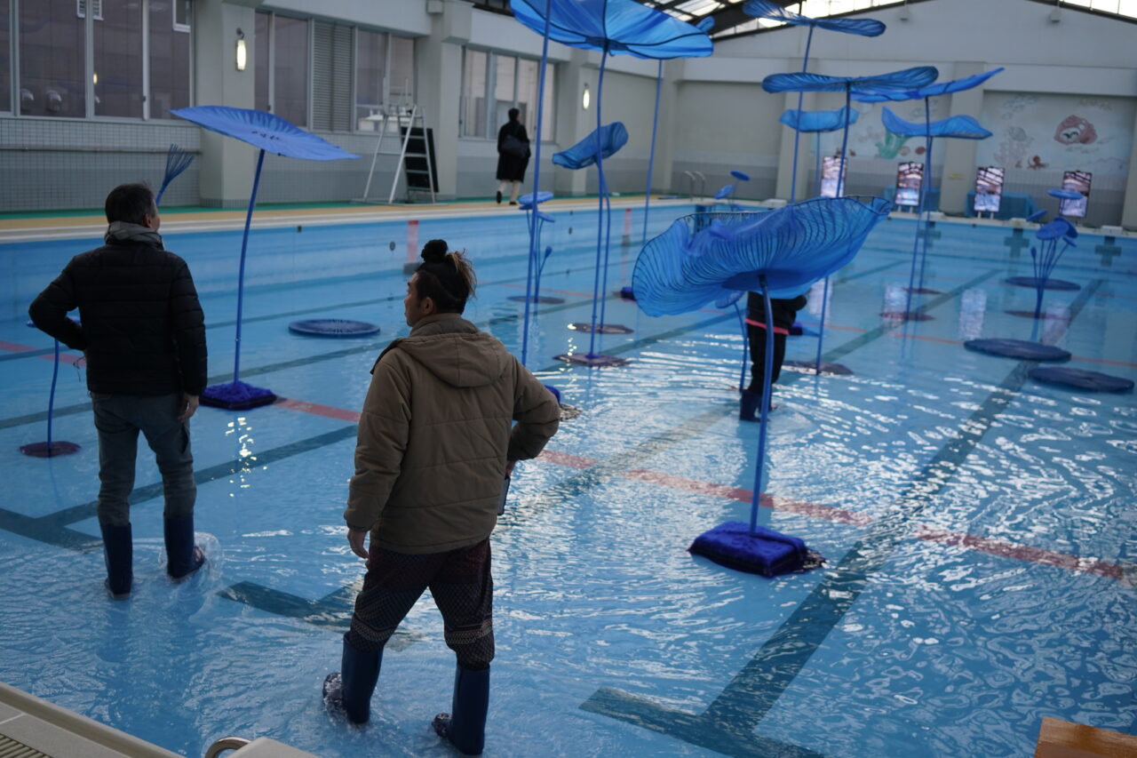 なお、このプールは数年間使用されておらず、解体が検討されているのだそうです。今回使用するにあたっては、芸術祭スタッフや市役所職員、そしてアーティストがプールを清掃するところからはじまりました。