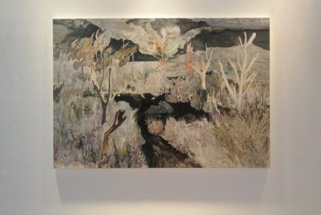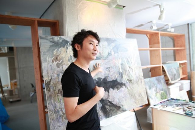 その内の一枚が、彼の代表作である雑木林シリーズ。今回の作品は同シリーズ13作品目に当たり、112×162cmのキャンヴァスに精魂込めて筆を入れている。まだ制作途中だが、すでに同シリーズの特徴である幻想的な雰囲気を醸し出している。