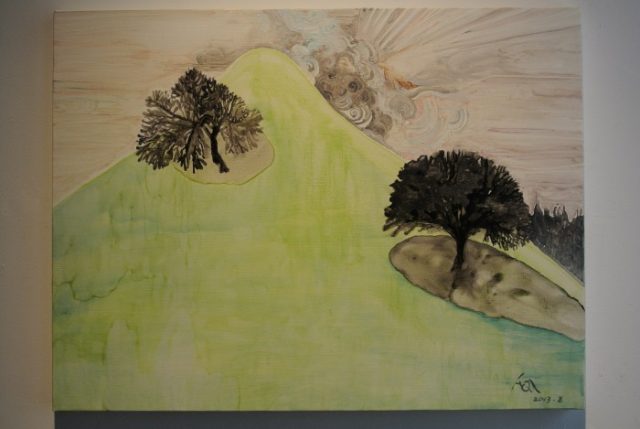 何千里さんは来日直後、画材が届くまでの期間を利用して、横浜・三溪園や鎌倉などを訪れている。日本で見た風景、肌で感じた風などからインスピレーションを受けたのだろうか。「今回、日本で描いた作品の中に、三溪園からインスピレーションを受けた作品があります。この小さな緑の丘の絵ですね。日本に来たからと言って、日本的な絵を描こうとは思っていません。あくまでも自分が好きだから描いた。でも空とか雲の雰囲気は日本的でしょ。でも、これは厳密には日本に来てから受けた影響だけではありません。小さい頃から日本の文化に触れてきたので、深層心理に日本的なDNAが入り込んでいるのかもしれないですね(笑)」