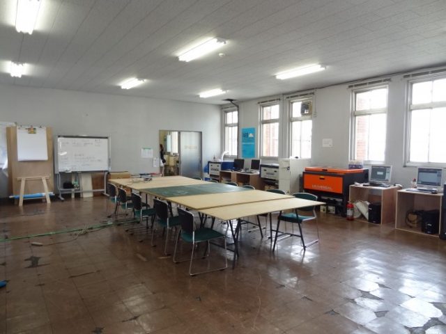 真ん中の大きな机は、イノベーションが起こりやすいオープンな環境づくりのひとつ(FAB9スーパーファブラボ)