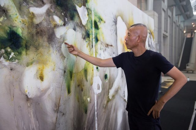 「もともと自分のキャリアは、キャンバスの上で絵画をつくることからスタートしました。中国では最初、油絵を描いていて、その上に火薬をまいて、爆破したりしていたんです。日本に来た頃も、最初はキャンバス作品をつくっていました。小さい頃から画家になることを夢見ていたんですよ。絵描きになろうとがんばっていた。だんだん大人になっていくにつれて現代美術に出会い、インスタレーションとか、爆発とか、花火とか……スケールの大きい作品、プロジェクトを展開するようになっていきました。そうなると小さい頃の絵描きのイメージからはだんだん遠ざかっていって、そういう点では少し寂しい思いもありますが(笑)。今回はまた日本に戻ってきたという意味も込めて、最初にキャンバスの上に絵画を描いていた時の気持ちに、もう一度立ち戻ってみようと思いました。“帰去来”というテーマには、自然に戻る、絵画に戻るという思いを込めています。」
