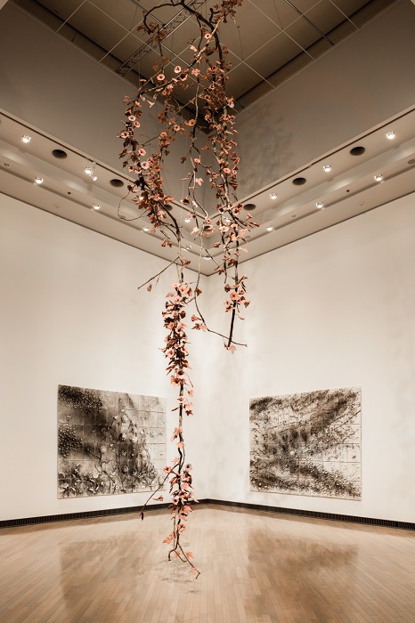 《朝顔》(2015年、陶、藤蔓、鉄、作家蔵)《春夏秋冬》(2014年、火薬、磁器タイル、作家蔵)の展示風景 Photo by KAMIYAMA Yosuke