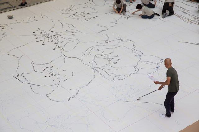 火薬ドローイング《夜桜》(2015年、火薬、和紙、作家蔵)の制作風景 Photo by KAMIYAMA Yosuke