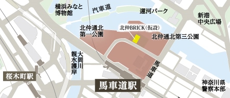 *馬車道沿いから横浜第2合同庁舎(レンガづくりの外観)とURの集合住宅(角にコンビニのサンクス)間入る。*旧来の歴史的建造物「北仲BRICK」とは場所が異なりますのでご注意ください。