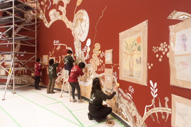 本展でも新作の壁画制作は、教育普及担当の全面的な協力を得て取り組んだという。壁画の素材となる土絵具を作るためのフォローアップや、グランドギャラリーに展示された《種を食べた獣(またの名を宇宙クッキー)》のワークショップ運営を担ったのが子どものアトリエ、市民のアトリエのスタッフである。