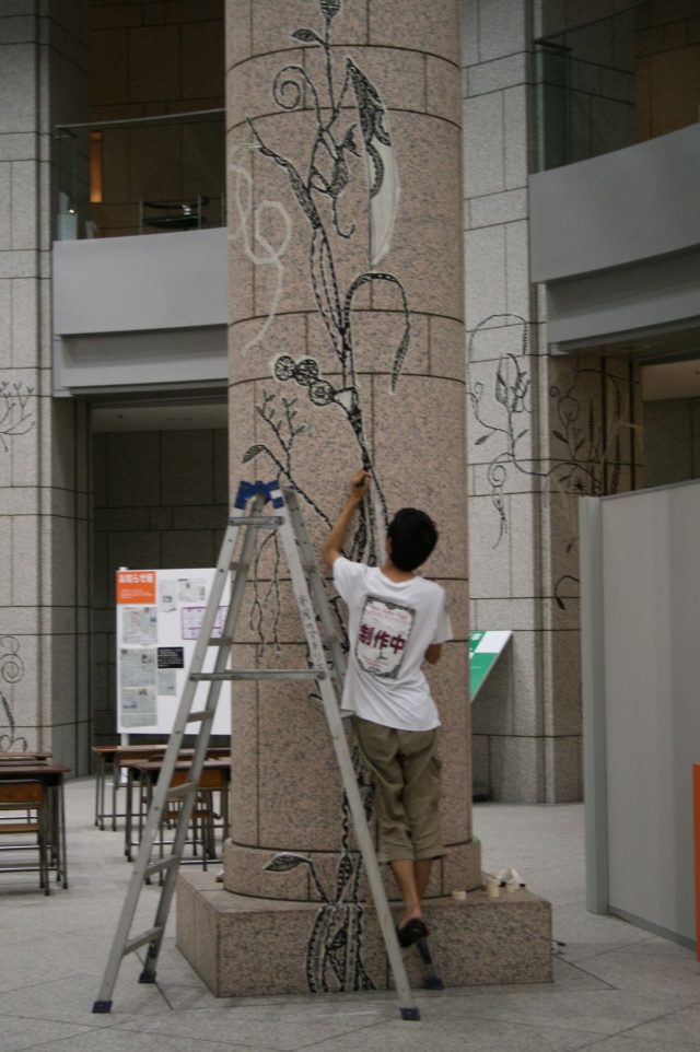 本展で庄司さんが担当したのは淺井裕介さんの展示室である。淺井さんはテープや泥などの身近な素材を用いて、学校や道路などの公共空間に介入し、作品を制作するアーティスト。横浜美術館で2007年に開催した「New Artist Picks」の個展では、美術館入口を入ってすぐに広がるグランドギャラリーやカフェなど館内全域を使った「マスキングプラント」に挑んだ。「マスキングプラント」とは、マスキングテープにドローイングした植物の枝葉のような絵が、柱や壁をはって伸びていくような作品だ。