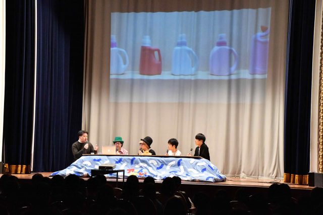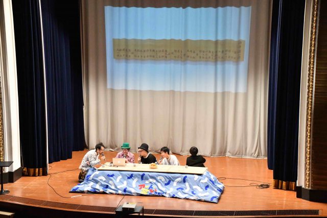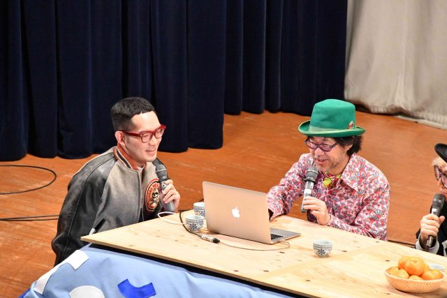 こたつがしつらえられた舞台上に現代アートの若手作家4人を次々に招き入れて、ジャルジャルの2人、デザイナーの千原徹也さん、倉本美津留さんが、あれこれ聞いていく。作品を「笑いとボケ」と捉えて、ときに作品に「ツッコミ」を入れながら、アーティストの制作に向かう心情を読み解いた。