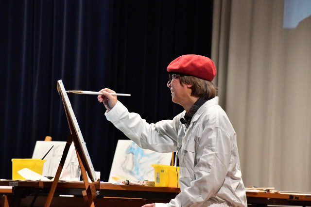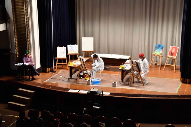 [3部]は「しゃべつくり」と題しての、しりあがり寿(漫画家)さん、会田誠(美術家)さんが作業着姿で登壇し、舞台上で作品を描くという趣向。会場から募った言葉カードを組み合わせてできた偶然の画題から発想して、15分ずつの時間制限で作品を描いていった。2人はピンマイクを付けられ、独り言やつぶやきも会場に聞かれてしまう。偶然の言葉の組み合わせの「滑稽なイメージ」や「笑い」から作品はどう生まれるのか、会場はしばしば笑いにつつまれながら2人の姿を見守った。
