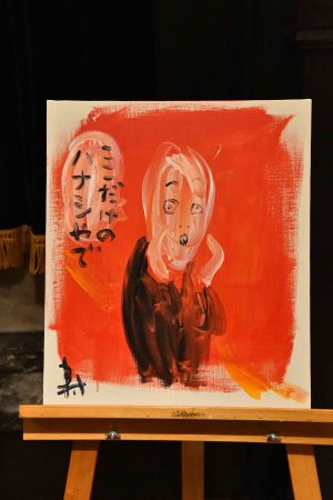 約束通り翌日、会田さんのツイッターには『吐き気がする企業戦略』のお題でダンボールに描いた作品が発表された。「描きました。ああ、壇上で描きたかった」とのコメントが添えられた。