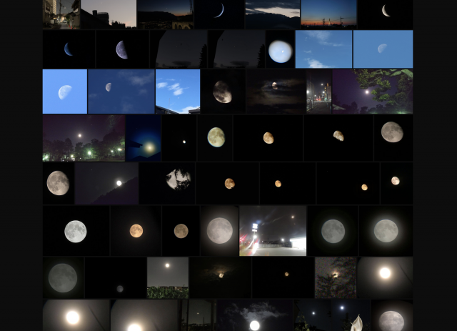 撮影された月の写真は、私の元に次々と送られてきていて、特設サイトで公開されていきます。これまで約600枚が送られてきていて順次更新されています。撮影日時が新しいものほど上位に来るように並べていき、そこで気づいたのは、全く違う場所(お互いの顔も名前重知らぬ者同士)で撮影されたにも関わらず、完全に同じタイミングで撮られたものもあることです。また月は、「月齢」による満ち欠けによって様々な形状になりますし、出入の時間も日ごとに大きく変わっていきます(空が明るくなってからの写真もあるのはそのためです)。しかしながらこれらの月は同じ一つの存在なのです。