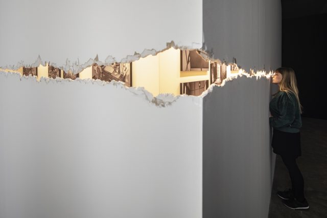 《アイムヒア プロジェクト》(部分)2018年 インスタレーション …石膏ボードのひび割れから、ひきこもりの部屋写真を覗き見る