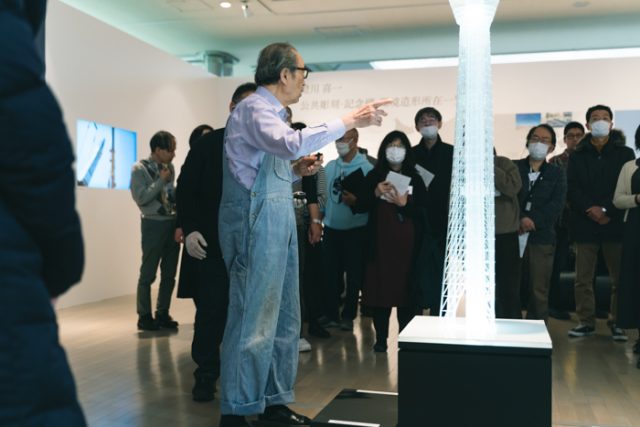 「III. ひろがり:公共空間を活かす」は澄川さんの公共プロジェクトを模型や写真で展望するコーナーだ。東京湾アクアライン川崎人工島「風の塔」や、東京スカイツリー®のデザイン監修など、大規模な公共プロジェクトも多く手掛けた澄川さん。展示パネルを前に「東京スカイツリー®は見る角度によって、「そり」と「むくり」が見られるので、いろいろな角度から眺めてみてください」と案内した。また、東京スカイツリー®の足元にあるモニュメントは澄川さんの鎮魂の思いをこめた作品《TO THE SKY》だと紹介した。