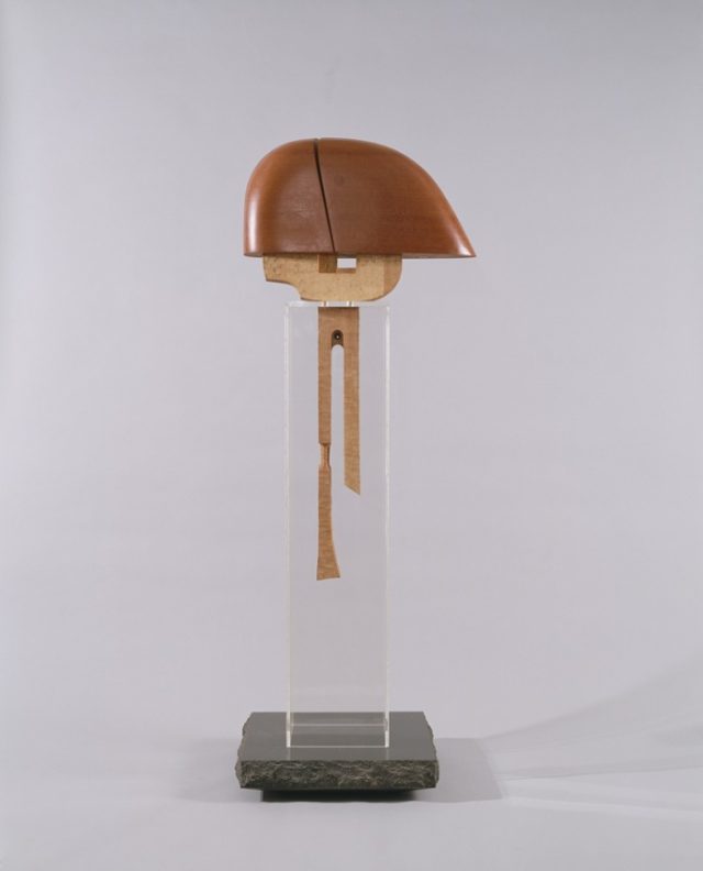 次に、具象彫刻から抽象彫刻へと展開し、「MASK」シリーズを制作した頃のことを回想。「MASK」シリーズは、甲冑や仮面を見て「人間がいないのに、そこにいるように見える」と感じたことからテーマとなったという。《甲冑》は、上野公園に生えていた桜の倒木を藝大に譲られていたものから彫りだしたもの。《MASK VI》の素材は餅臼を半分にして作った作品だと明かした。また、「MASK」シリーズの最初の頃は、まだノミ跡を残した作風だったが、そこからだんだんとノミ跡を残さない木の美しさを生かした作風にしていったと作風の変化について説明した。