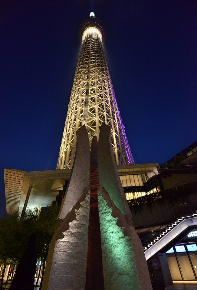 ※手前:《TO THE SKY》2012年 御影石 東京スカイツリータウン® ©Sumikawa Kiichi/奥:「東京スカイツリー®」2012年 *デザイン監修 撮影:内海敏晴