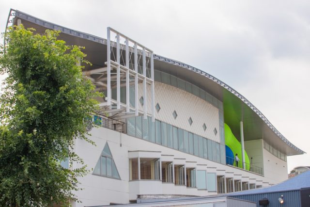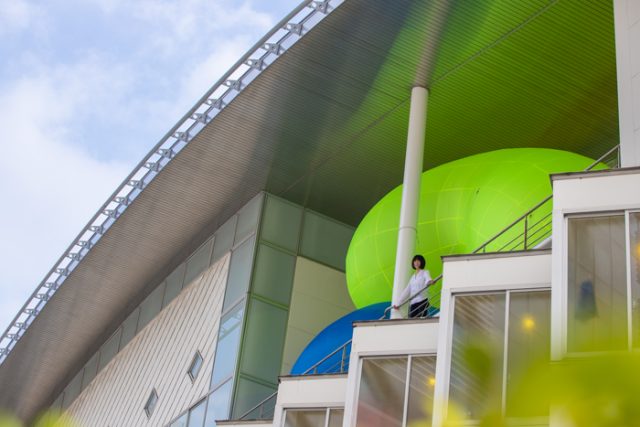 「プロット48」会場は横浜美術館から歩いて7分ほどの距離。もともとは子ども向けの施設だった建物を改装した会場で、その面影をところどころ残しながら新しい場所に生まれ変わっている。2つある棟のそれぞれのテラスに空気でふくらんだオブジェの姿がある。鮮やかな黄色と青色のものと、もうひとつはオレンジのものだ。これがさとうりささんの作品「双つの樹」だ。