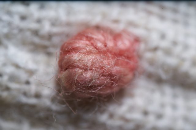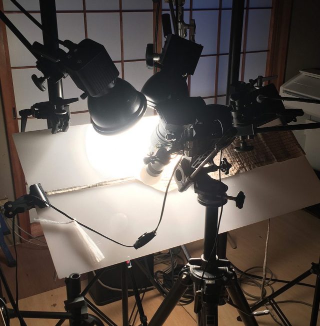 小さい縫い目を拡大撮影するためにF直の低い(暗い)マイクロレンズを使用したので、1万5000ワットの閃光を当てなくてはならず、始めた頃にはその強いフラッシュの紫外線で顔に軽いやけどを負ってしまいました。 1000枚を撮り切らなくてはならないという辛い作業の連続でしたが、でも自分で好き好んでやっているわけですからね。にわか仕込みのヨガで身体をほぐしながらしのぎました。