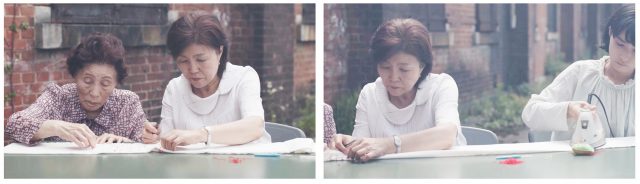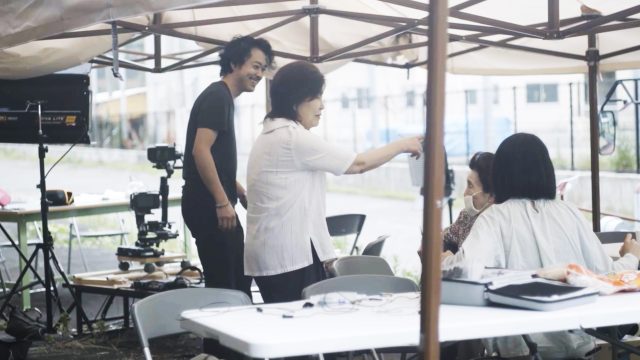 新井:広島で撮影をしようと計画していましたが、緊急事態宣言が解けて実施できたのは6月6日でした。実際に千人針を縫った経験のある92歳の女性、そしてその娘と、若い孫世代の女性に出演してもらいました。「おばあちゃん」が玉結びを縫って、「娘」がそれをほどく、「孫娘」がその布にアイロンをかけるというストーリーです。自主隔離のかいもあり、やっと映像撮影ができたことが嬉しかったですね。原爆遺構のひとつである旧陸軍被服支廠という建物の前での撮影です。ここは軍服の製造や修繕を大規模に行っていたところで、たくさんの女性が縫いもの仕事をしていた場所です。当初は秘められた祈りとして始まった「千人針」と重なりながらも対極の背景を持っています。