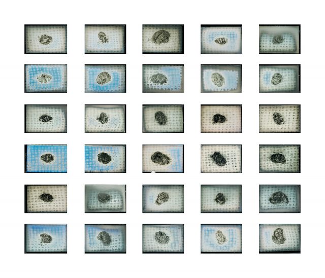 新井:今回は「千人針」をモチーフにしています。「千人針」というのは、一枚の布に千人(注)の女の人が赤糸で一針ずつ刺して縫い玉をつくって出征兵士に贈ったものです。古書店で入手しました。その縫い目を撮影した1000枚のダゲレオタイプの写真を壁面いっぱいに並べ、それに向き合う形で映像作品を展示します。つまり、ダゲレオタイプの撮影と、映像制作を同時に進めなければならなかったのです。こんなに作品づくりがぎりぎりになったのは初めてです。