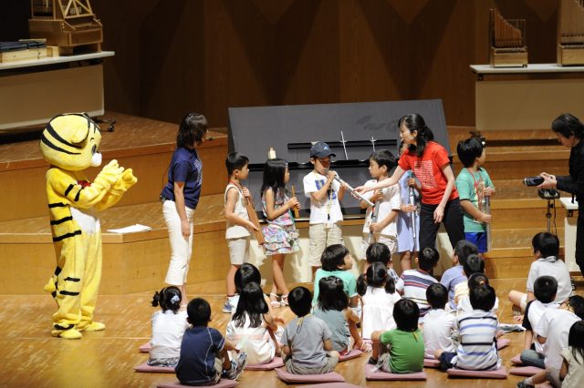 2009年「夏休みオルガンわくわく大作戦」でのワークショップで子どもたちにオルガンをわかりやすく紹介する三浦はつみさん。 キャラクター“みなとらくん” も人気を博した。 写真提供:横浜みなとみらいホール
