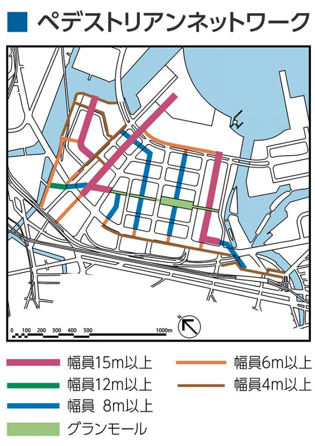 この横浜みなとみらい21地区においても、陸から海へと歩く動線として「キング軸」、「クイーン軸」が整備されます。そして、それらを横繋ぎする「グランモール軸」と「ペデストリアンネットワーク」と称した空間が整備されることで、縦横の歩行空間ネットワークが構築されています。
