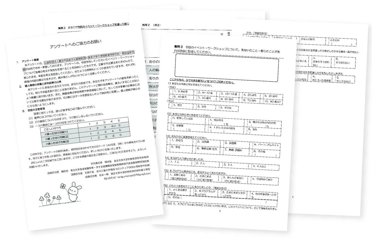 松本(岡田猛研究室)みなさまが今までお話されてきたように、紙のアンケートに、同じ項目セットを用意して、同じように答えてもらう形式には確かに限界があります。映像や、その場のスタッフの方々が見たものを臨機応変に取り出していくものの方がいいんじゃないか、というご指摘は、とても的を射ているように感じます。他方で、質問項目を減らしてしまうと、他の研究や他の調査と整合的に比較できなくなってしまうんですね。なので、なるべく項目数を減らさないまま、いくつかの側面を押さえるようにした結果、現在の指標のセットになりました。