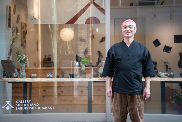 田口竜太郎(以下、田口):ここ(Gallery+Sushi三郎寿司あまね)を始める前は、都内にケータリングで寿司を握りに行っていたんです。アーティストや洋服のブランドをやっているような友人がいて、お寿司だったらにおいが付かないし油も火も使わないので仕込みさえしていけばどこでもできますから、そういう現場で寿司を握るようになって。