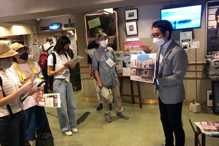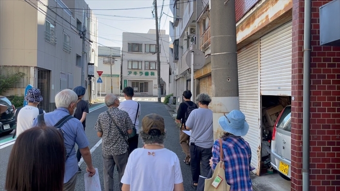 横浜の下町と呼ばれる末広町〜若葉町〜横浜橋を歩くツアー。横浜市立大学3年生で横浜の関外エリアを中心に、場づくりとアーカイブを行う「下町編集室OKASHI」代表の小林璃代子さんがツアーコンダクターを勤めました。「似て非WORKS」では現代アートが生まれる場所に触れたり、映画館の「シネマ・ジャック&ベティ」では映写機が作動する現場を見学。
