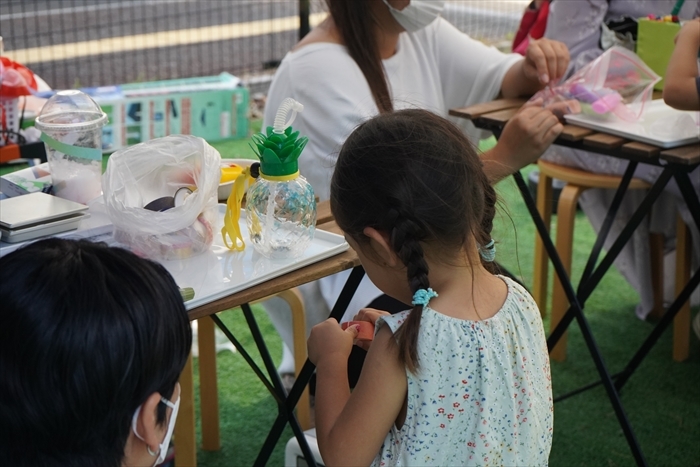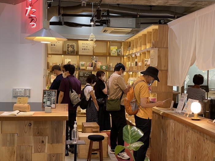 会場に立ち寄った人たちは、親子でモノづくりワークショップを楽しんだり、じっくり本屋さんをのぞいたり、カフェで飲み物を買って「50組×20mの波止場」やパビリオン中央に置かれたイスとテーブルでおしゃべりしたり、物思いにふけったり、、、思い思いの方法で楽しんでいて、会場にはのんびりと穏やかな空気が流れていました。