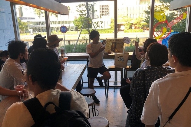 ブリュワリーが大切にする想いで作られたビールを堪能するだけでなく、それぞれに関わるクリエイターの話を交える構成で、ラベルデザインを手がけるデザイナーや、ビールのモルト粕をアップサイクルしたクラフトビールペーパーの企画者の紹介も行いました。参加者同士の交流もあり、ビールを飲む時間がより実りある時間になりました。