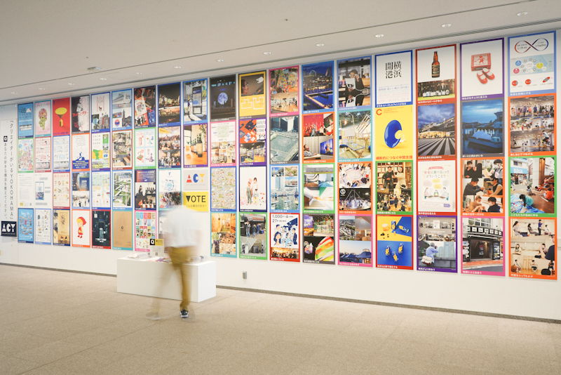 展示のディレクターは、スタジオニブロールの矢内原充志さん。会場では、市庁舎の壁一面に「クリエイターがいることで生まれた風景」と題し、100枚のパネルを展示。間近でパネルを見ると、中は横浜ならではの“人の営み=風景”として、建築空間やグラフィックデザイン、イベント、商品などがうつしだされ、外はカラフルな色と短い文で囲われています。枠の色は「都市・水辺」、「食・農業」、「福祉・医療」、「国際交流」などいった社会分野を意味しているので、クリエイターが社会の様々な分野で活躍していることがわかります。また、展示をひいて全体で見ると、組み合わさった色がまるで横浜の街とクリエイターの関わりの多様性をあらわしているようにも見えます。