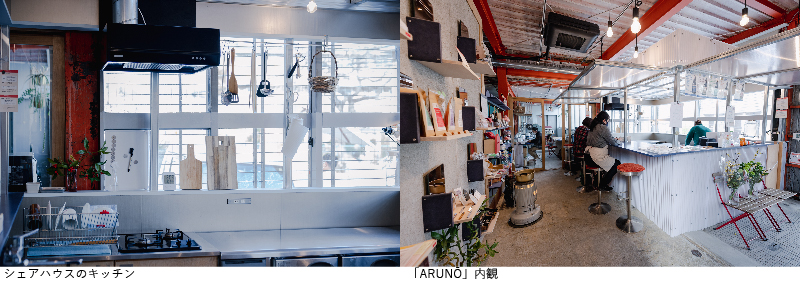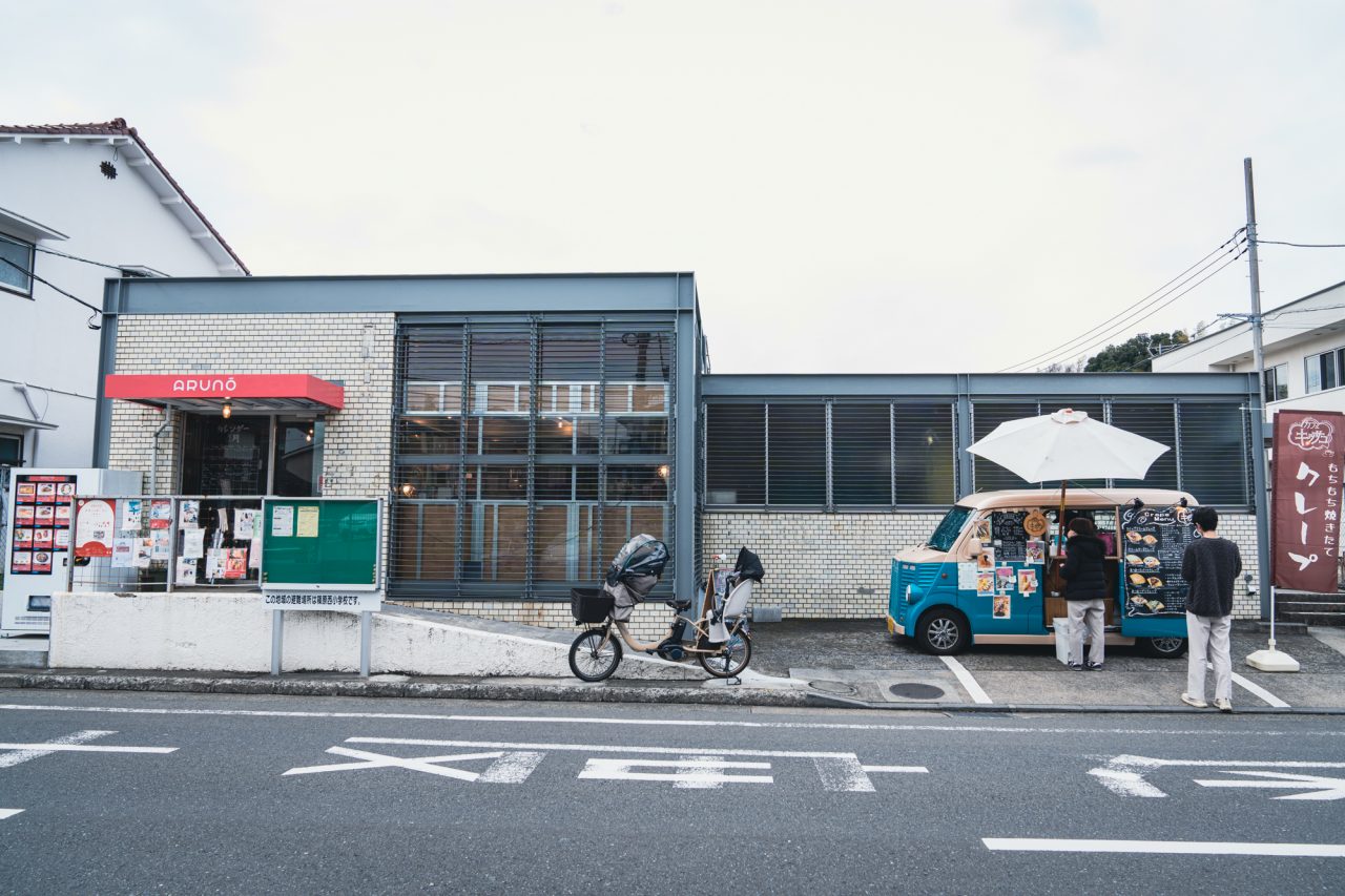 ドアの上の赤いサインには、「ARUNŌ」の文字。地域の要の位置にある空き建物を改修して文化複合拠点とする、ウミネコアーキの事業の第1号店だ。