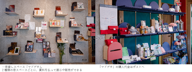 35枠ある一窓貸しの「マドグチ」も、固定収入を確保しながらたくさんの人に関わってもらう仕組みの一つ。一面まるまる空いている壁にあったギャラリー利用の料金案内は、「考えてなかったんですが、『展示もできるんですか』と聞かれてその場で相場を調べて作りました」と若林さん。「こういうことをやりたいんだけどできますかと聞かれたら、なるべくどうやったらうまくできるか全力で考えたい」と、どこまでもフレキシブルだ。