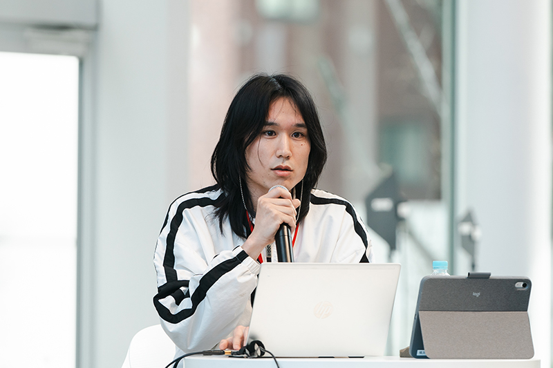 今回の応募は、本牧にある三溪園の創設者であり、実業家の「原三溪」への深い関心から。原三溪が、美術・建築を積極的に支援していた一方で、当時日本の植民地だった朝鮮で土地開発や事業活動をしていたことを起点にリサーチを開始。横浜開港資料館や図書館での資料調査、三溪園や韓国での実施調査、専門家との意見交換などを行い、さまざまなことがわかってきたと語りました。滞在拠点の「ARUNŌ-Yokohama Shinohara-」で開催した中間報告会には専門家なども来場しました。