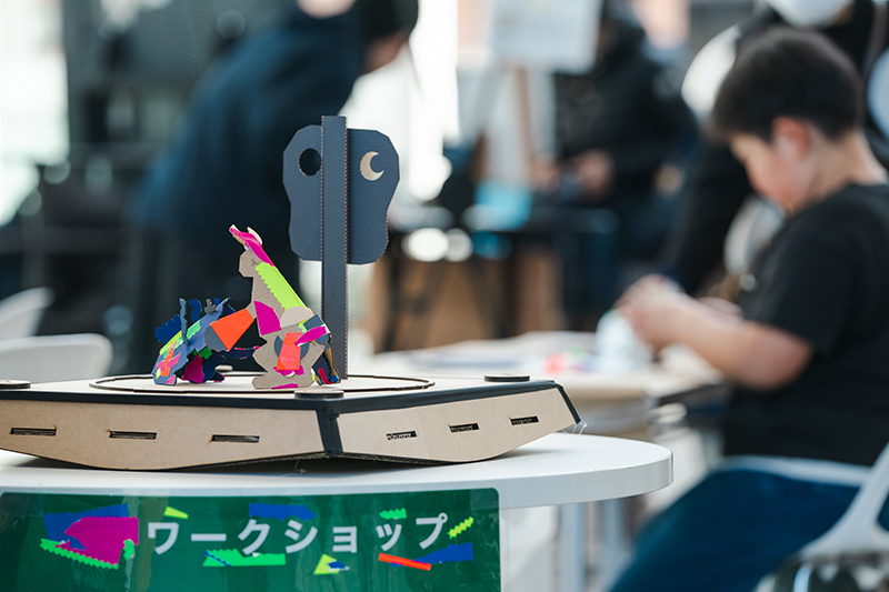 「関内外クリエイターズ」による、会場のサインのミニチュア版を用いた「あなたの好きな横浜を組み立てよう!」や、「アートルームルミエール」のアルコールインクを使ったオリジナルコースターづくり、「MO!asobi」の「スーパーハイパー力士を作ってあそぼう!」など。親子の参加者も多く、報告会の間も子どもたちの楽しそうな音が聞こえ、にぎわいをみせていました。