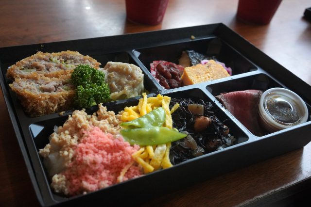 「yuinowa」に着くと、「結いプロジェクト」の飯野さんと野口さんが出迎えてくれました。長い移動を終えた参加者、まずは腹ごしらえです。用意していただいたのは、「結城縁旅弁当」。結城産の野菜や茨城県のブランド豚ローズポークなど、地元の食材をふんだんに使用したお弁当です。