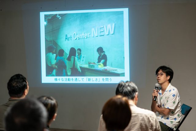 奥のギャラリーは、コンクリート打ちっぱなしの広々とした空間で、展覧会のほか音楽ライブや演劇、上映イベント、アートフェアなど、多様な芸術文化活動を展開する場所です。小川さんは発表の最後に今後の活動(ぜひNEW公式サイトのEVENTページをご覧ください:https://artcenter-new.jp)について紹介し、他組織や企業、行政との協働について話しました。