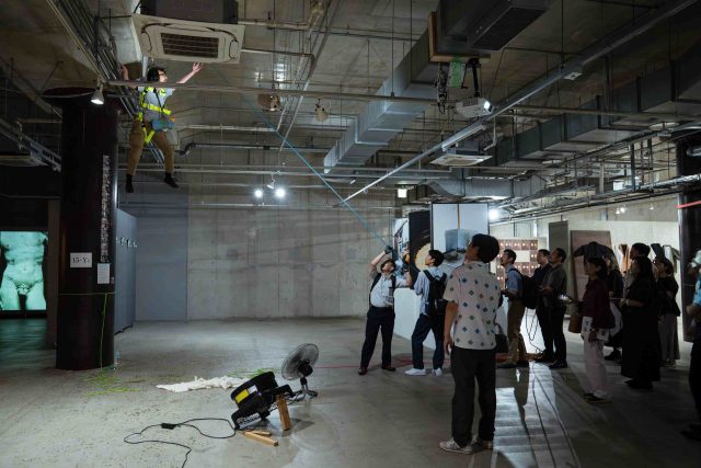 ACYフォーラムの関連企画として「Art Center New 見学ツアー」も開催し、小川さんに展示を案内していただきました。グランドオープニング展覧会「NEW Days」にて、アーティストの東野哲史さんによるパフォーマンスの様子。