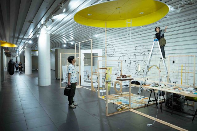 「NEW Days」の展示は通路側の無料のスペースにも展開。展覧会中に制作過程を見せるアーティストの三田村光土里さん(右)と小川さん(左)