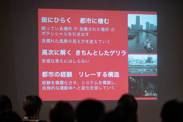 最後に細淵さんから、現在取り組んでいるプロジェクトの紹介がありました。横浜では、みなとみらいエリアやヨコハマポートサイド地区などで、シェアスタジオや街なかでのプロジェクトや展示などに引き続き取り組んでいます。